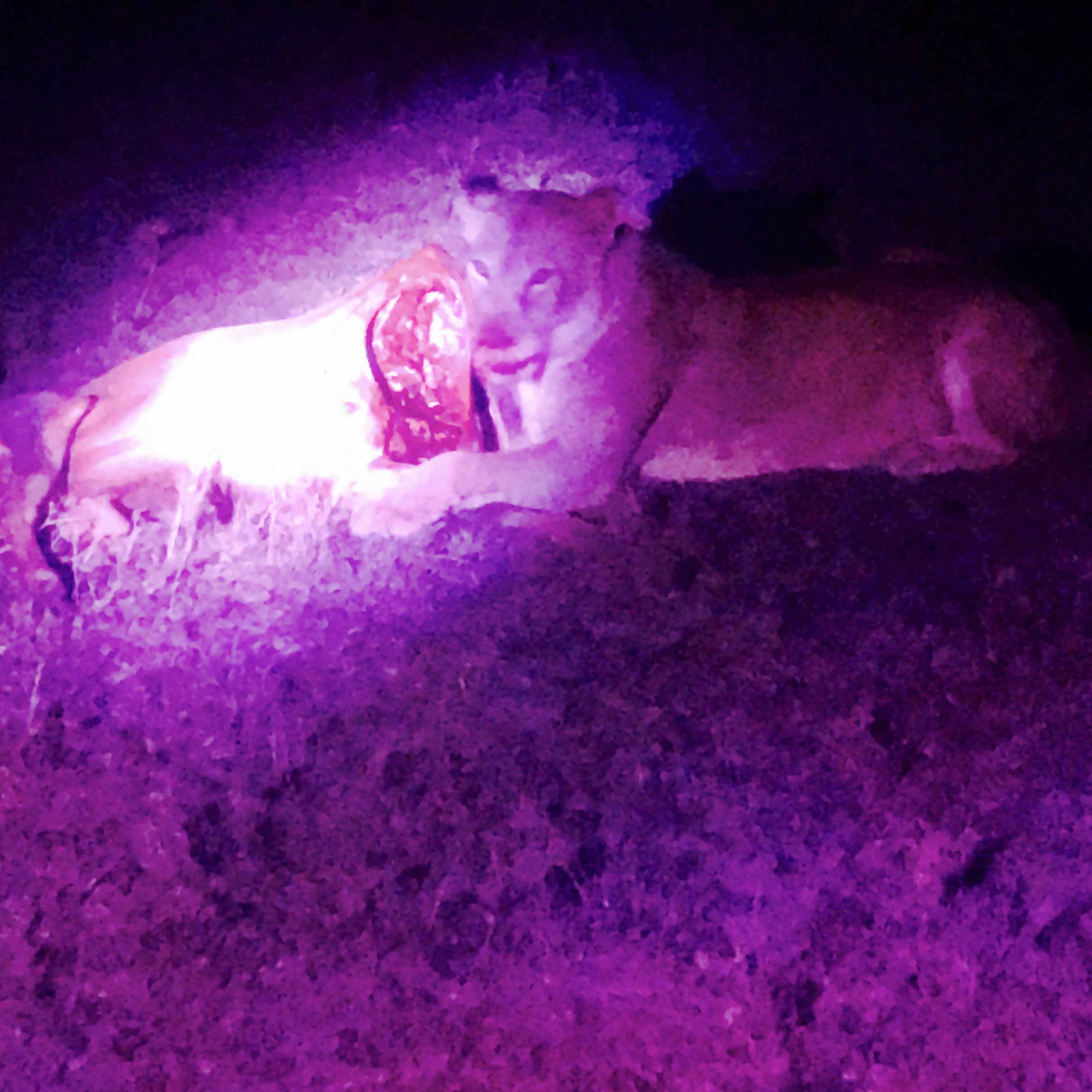 At vi sitter i en bil bare tre meter fra løven, enser hun ikke. Hun er sulten. Ifølge Manfred har hun ikke spist noe på to døgn, og nå skal hun endelig få seg noe mat. Hun begynner på antilopens bakparti. Vi kan høre hvordan hun spiser antilopekjøtt og slurper i seg blod.