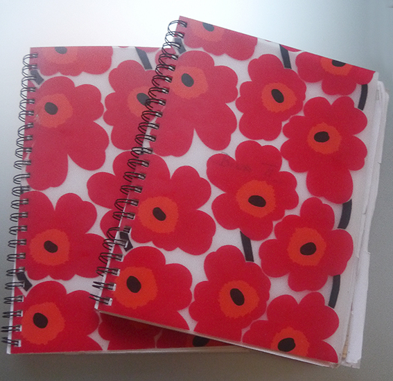 En rødblomstrete Marimekko-bok ble to i antall i løpet mitt sykeleie. Eldstebroen min skrev hver en dag, foruten for venner og resterende familie, som la igjen en hilsen til meg.