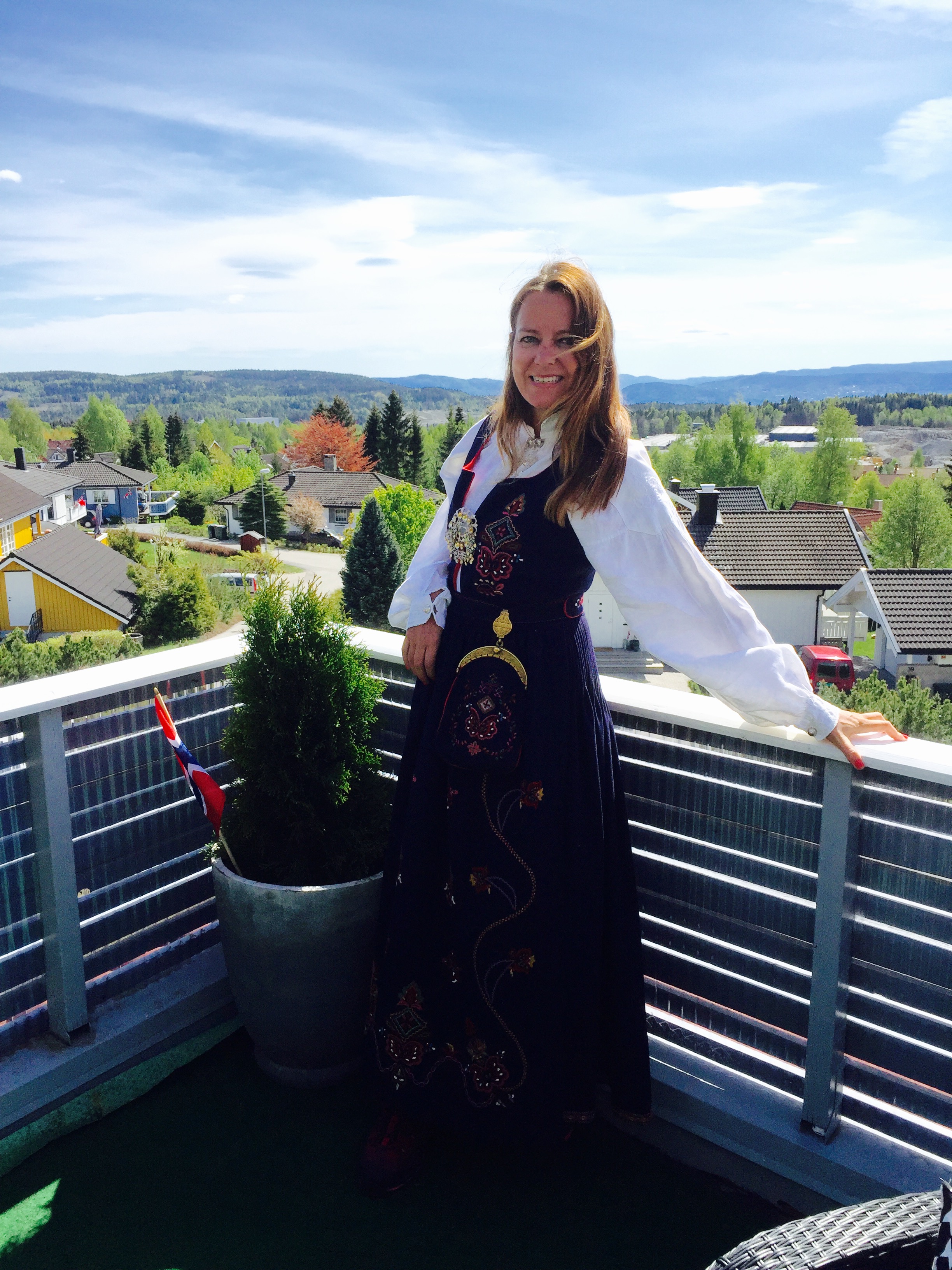 Min bunad er fra Sunnmøre, og det er over 30 år siden mamma broderte den til meg. Den bærer preg av å ha vært med meg på de fleste 17. mai-feiringer opp gjennom årene med pølser, is og brus. 17. mai har dessuten vært morsomme champagne-frokoster med mange gode venner rundt bordet og hipp, hipp hurra, foruten for mer høytidelige tilstelninger som barnedåper og konfirmasjoner.