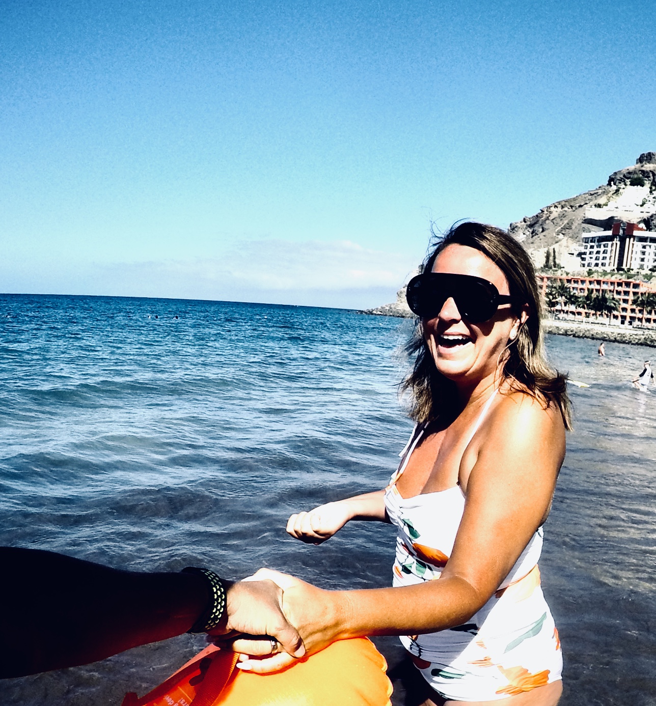 Han kommer mot meg, kysser meg på kinnet og tar meg i hånden. I den andre hånden bærer han en oransje oppblåsbar badepute. Hand i hand gaar vi utover mot bølgene.