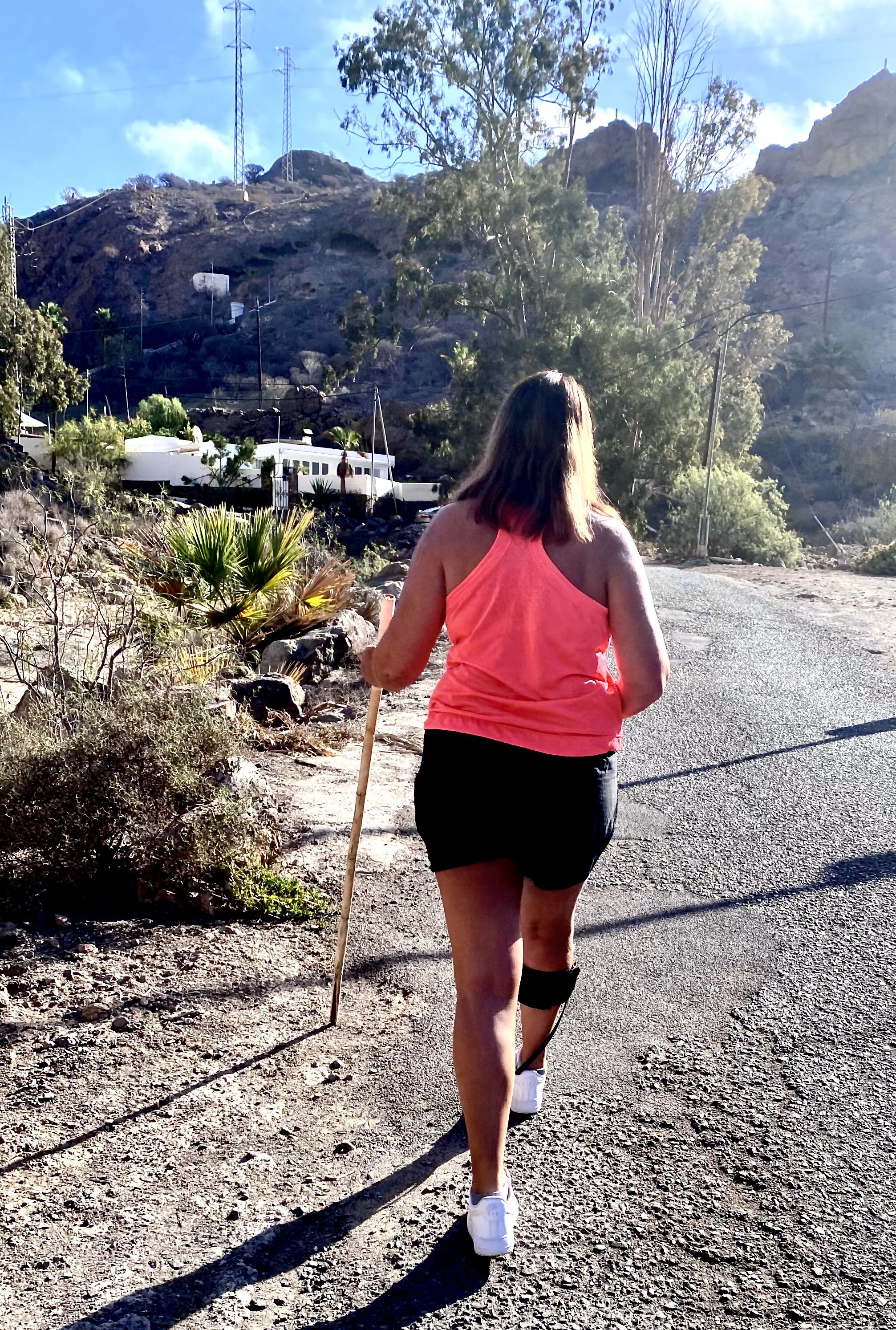 Lufttemperaturen er rundt 25 grader og jeg kjenner jeg begynner å bli svett. Jeg har gode sko med skinna rundt høyre fot, en svart shorts og en lett knallrosa treningssinglet fra Nike.