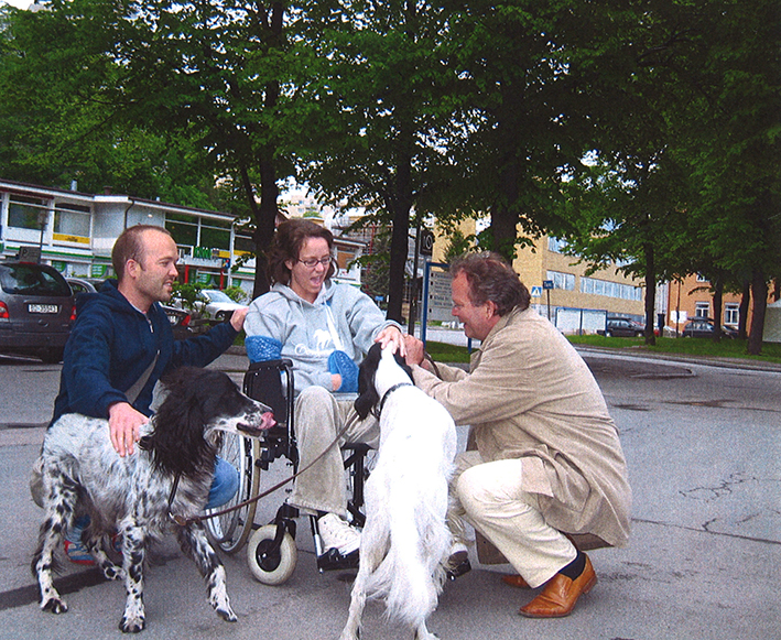 De elleville engelsk setterne hans venter på at vi skal komme trillende, like glade for å se meg som før jeg fikk slag! Og om de merker at jeg sitter i rullestol og er lam i halve kroppen, så viser de det i hvert fall ikke.