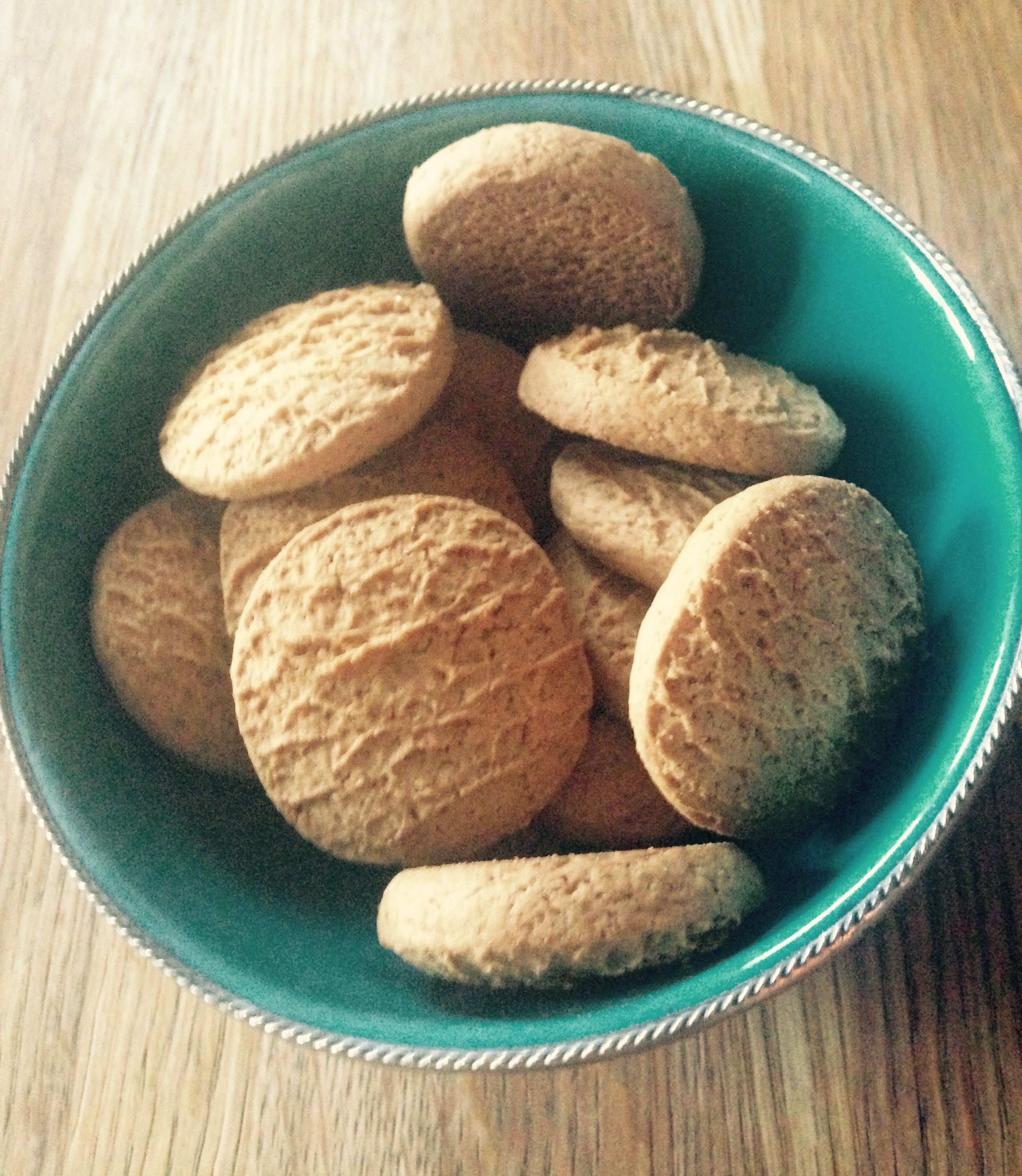 Jeg setter fram de hjemmebakte småkakene som søsteren min har tatt med til meg. Jeg er fornøyd med å ha noe å by gjesten på.