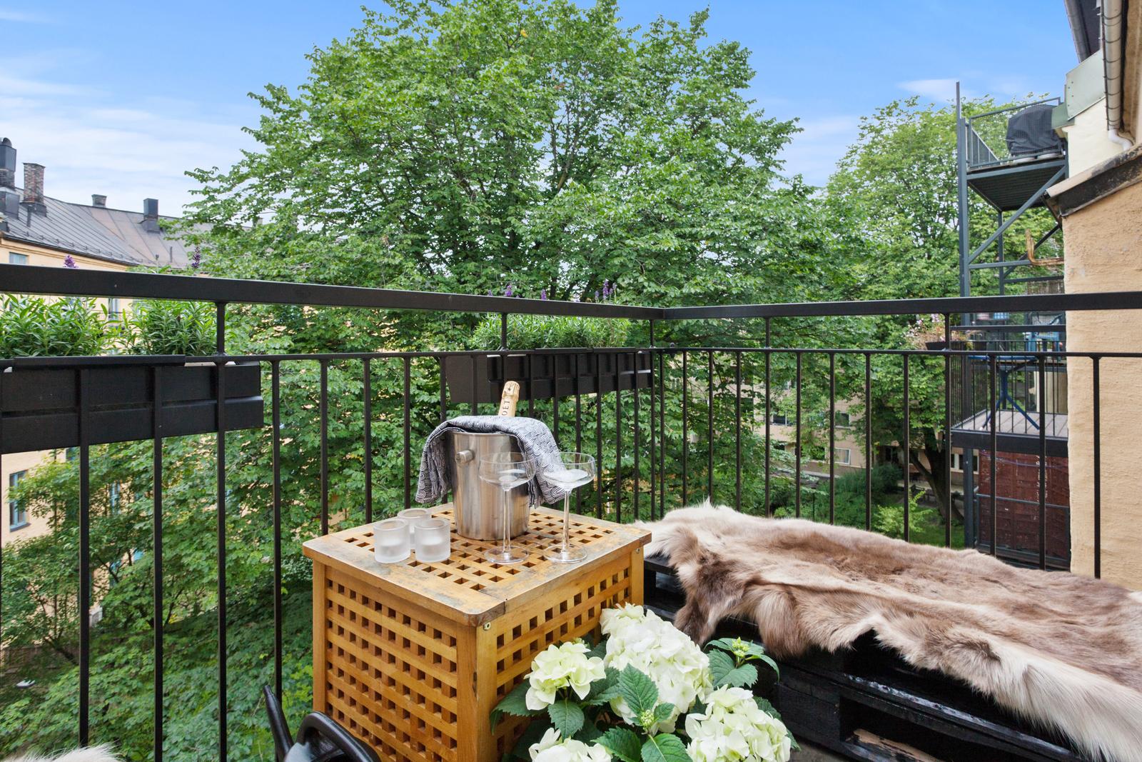 Jeg går ut på verandaen, som vender ut mot den stille bakgården. Jeg har med en flaske champagne og et par glass som jeg setter fram til visningen. Jeg vet at jeg snart kan lukke dette kapitlet av livet mitt. Og det er med gode tanker jeg gjør det. Jeg smiler.