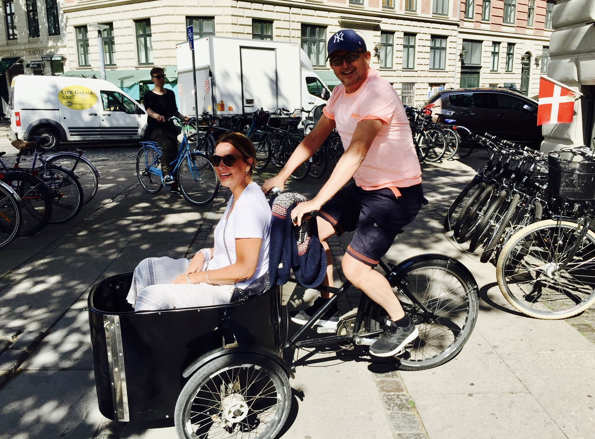 København er en by for syklister, alle sykler her. Byen er godt utbygd for de syklende og terrenget er flatt. Han går foran meg bortover gata, og er så ivrig at han nærmest drar meg inn i butikken for sykkelutleie, en av mange i København, som ligger på hjørnet for der vi bor.